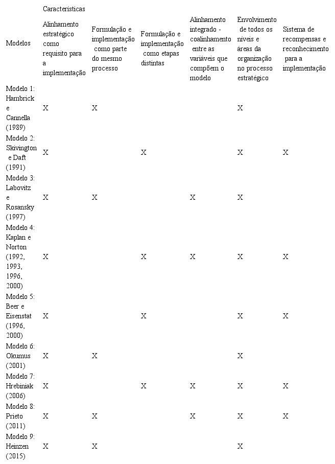 Assim, os modelos de Alinhamento Interno têm a finalidade de assegurar que as atividades necessárias à implementação da estratégia sejam ordenadas de maneira lógica e integradas, e levem ao sucesso na atividade de implementação da estratégia (Hrebiniak e Joyce, 2001; Prieto e Carvalho, 2016). Para a realização desta pesquisa foi realizada a busca nas bases SciELO, Periódicos CAPES e SPELL com o propósito de identificar modelos de alinhamento estratégico interno. Foram identificados nove modelos e elaborado um quadro comparativo (Tabela 1) para demonstrar as principais características tendo como referência os atributos analisados por Prieto et al. (2009), Prieto (2011) e Heinzen (2015).