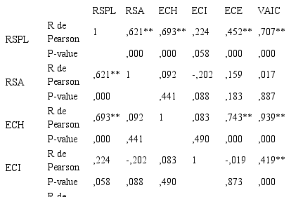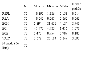 Segundo pesquisa realizada por Brandt (2014) no setor bancário, em empresas de capital aberto, e concluiu que o VAIC não tem forte correlação com os índices de rentabilidade. Com relação ao RSA e RSPL, ambas demonstraram pouca correlação, em índice relativamente baixo, demonstrando uma dependência das empresas neste setor dos ativos físicos e financeiros.
