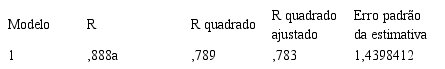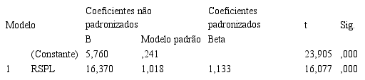 Na análise do Quadro 4 obtém-se a informação de que o coeficiente de correlação (R) de 0,888 representa o grau de associação entre as variáveis dependente e independentes. O R² de 0,789 é denominado de poder explicativo da regressão, significa que 78,9% da variação do VAIC, é explicado pelo conjunto das variáveis independentes RSPL e RSA. O R² ajustado de 0,783 o que é significante, demonstrando, neste caso, que 78,3% da variação do VAIC é devido aos índices de rentabilidade RSPL e RSA.