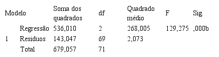 O Quadro 5 apresenta o valor prova (p-value) inferior a 0,05 o que significa que o modelo pode ser validado, uma vez que o nível de significância é menor que 0,05 ou 5%. O teste F é outra forma de verificar a validade do modelo. Consiste em se verificar a probabilidade de que os parâmetros do conjunto de regressão sejam igual a zero, o que invalidaria o modelo. Neste caso o valor foi bem superior foi de 129,275, o que demonstra mais uma vez a validade do modelo de regressão, indicando que, pelo menos uma das variáveis independentes exerce influência no VAIC.