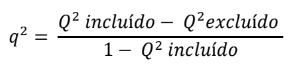 Os valores Q2 e q2 estimados pelo procedimento blindfolding representam uma medida de quão bem o modelo de caminhos pode predizer os valores inicialmente observados e o impacto relativo da relevância preditiva, respectivamente. A fórmula para o cálculo é: