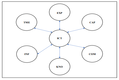 For better clarification, figure 1 shows how the ICT and the academic variables will be tested. The focus is to establish how ICT connects with TME, EXP, CAP, COM, KNO, and INF, even though correlations among the six academic aspects will also be reported. I must highlight that the two-sided blue arrows represent correlations, not the impact of an independent variable on a dependent variable.