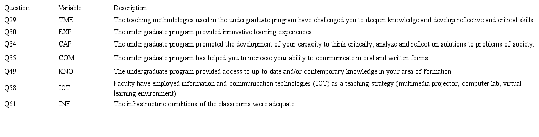 Column “Question” identifies the order that questions appeared in the 2015 ENADE’s electronic survey. For instance, Q29 was the 29th question of the electronic survey. Column “Variable” represents the names of variables used in this study. Column “Description” describes the questions. Students responded these questions considering a 6-point scale, ranging from 1 (totally disagree) to 6 (totally agree). Intermediate levels of the scale were not labeled. Also, students could answer “I do not know” or “It does not apply” to the questions. Due to the strict objective of this study, not all data from the 2015 ENADE’s electronic survey were kept in the dataset, only the relevant ones (students’ sociodemographic information and questions referred in Table 1).