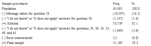 Table 2 shows sample procedures. 2015 ENADE was taken by a total of 65,483 accounting students, which represents the population of the study. Question 58 of the electronic survey is the focus of this study since it asks students whether instructors are employing ICT as a teaching strategy during the accounting program. Missing values for question 58 were eliminated. I also chose to exclude “I do not know” or “It does not apply” answers for question 58 in order to avoid interpretation problems when analyzing the results. I then obtained an intermediate sample of 53,739 observations. Likewise, I dropped those observations that had “I do not know” and “It does not apply” answers for questions 29, 30, 34, 35, 49, and 61, which constitute other variables of interest. Ultimately, I excluded a student who had an error measurement in his/her gender information. Final sample consists of 51,269 students (78.3% of population).