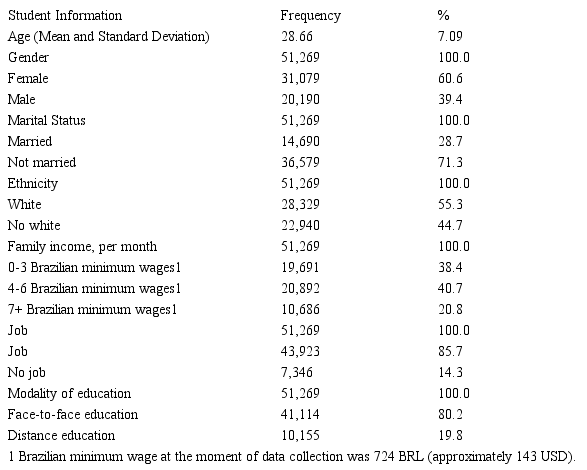 Table 3 describes students’ information. Majority of students are female (60.6%), not married (71.3%), white (55.3%), with a family income per month between 4 and 6 Brazilian minimum wages, with a job (85.7%), and taking a face-to-face undergraduate accounting program (80.2%).
