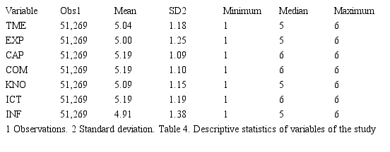 Regarding other relationships, I emphasize that the highest correlation is between TME and EXP (coeff. = .75; p < .01). It suggests that teaching methods have influence on students’ innovative academic experiences. This finding is also expected as students spend most of the time inside classrooms or paying attention to the instructor. Given that, teaching methods can be both positive and negative experiences for students, depending on how instructors design and execute them. The lowest correlation, albeit significant, is between COM and INF (coeff. = .50; p < .01). This moderate positive correlation denotes that infrastructure impacts on the development of students’ communication skills. This empirical evidence supports the general idea that educational institutions must offer adequate infrastructure for students to obtain the skills demanded by the job market.