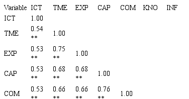 Since Shapiro-Wilk’s and Shapiro-Francia’s tests indicated that data did not follow normal distribution (p < .05), I utilized Spearman’s correlation matrix to test the relationships. Table 5 shows the results. Due to the results showed in Table 4, I could expect significant correlations among the variables of the study. All relationships are significant at .01 level. However, I emphasize the ICT column.