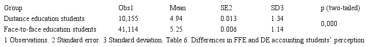 Descriptive statistics (Table 4) showed that students strongly agree with the questions. It suggests that students are satisfied with the teaching methods, learning experiences, the use of ICT as a teaching strategy, education institutions’ infrastructure, and the accounting program in general. Spearman’s correlation matrix (Table 5) demonstrated that all variables were significant associated. I highlight the correlation between ICT and EXP because its practical implications. It seems that use of ICT as a teaching strategy can offer a more attractive educational process, promoting innovative learning experiences. Thus, education institutions may benefit from this evidence by adopting the newest and useful ICT. Another important positive correlation is between ICT and KNO. By utilizing ICT in the learning process, students are able to search for information in real time. It means that up-to-date knowledge can be learnt. If ICT is not available during the education process, knowledge acquisition would be limited to the content of text-book and the instructor, which may not be updated or instantly accessed. Ultimately, I sought for differences between perceptions of accounting students who were taking FFE or DE (Table 6). Evidence supported that the use of ICT as a teaching strategy was perceived in a more intense way by FFE students than DE students. It may be related to the form in which question 58 was asked, as discussed in section 4.