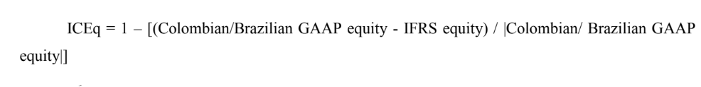 where ICEq is the index of conservatism of equity; IFRS equity is the equity according to IFRS; Colombian/Brazilian GAAP equity is the equity according to Colombian or Brazilian GAAP before IFRS; and |Colombian/Brazilian GAAP equity| is the absolute value of Colombian or Brazilian GAAP equity. The equity data before and after IFRS were taken from the financial reports upon initial adoption of IFRS in relation to the adjustment made in equity at the date of transition (January 1, 2009, in Brazil and January 1, 2014, in Colombia). If ICEq was greater than 1, then accounting in Colombia or Brazil was less conservative after the adoption of IFRS in relation to the recognition and measurement of assets, liabilities, losses and gains, and the cumulative effects on January 1, 2014 and January 1, 2009, respectively.
