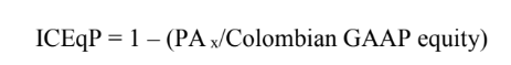 where ICEqP is the index of partial conservatism of equity; PAx is the partial adjustment of the accounting theme x in equity; and Colombian GAAP equity is the equity according to Colombian GAAP before IFRS. Earning and equity data before and after the IFRS and the estimates made by the companies for the initial adoption were taken from the financial reports on the initial adoption of IFRS in relation to accounting item x.
