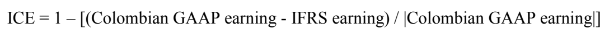 where ICE is the index of conservatism of earning; IFRS earning is the earning according to IFRS; Colombian GAAP earning is the earning according to Colombian GAAP before IFRS; and |Colombia GAAP earning| is the absolute value of Colombian earning. Earnings data before and after the IFRS were extracted from the financial reports upon initial adoption of IFRS and compared to 2014. If ICE was greater than 1, then the 2014 earnings in Colombia after the adoption of IFRS were less conservative than those presented in that year that were in accordance with previous accounting standards.