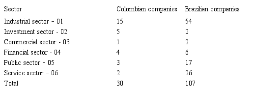 Our study population comprised companies listed on the Stock Exchange of Colombia and the Stock Exchange of Brazil with market capitalization. For the Colombian sample, we obtained 75 companies that had stock market capitalization on September 11, 2016. The final sample comprised 30 companies representing 77% of the stock market capitalization of Colombia. The data were extracted from the 2015 financial reports of the Financial Superintendence of Colombia website (www.superfinanciera.gov.co).