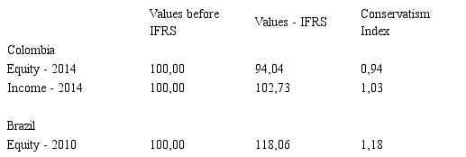 Through the context analyses of the notes of the 473 Brazilian listed companies that reported their financial statements according to IFRS in 2010, 107 entities presented their equity value and their income value in accordance with the Brazilian accounting practices in the base date 2010. Brazil adopted in two stages, one in 2008 and one in 2010. The comparison of the profits in accordance with the different accounting standards generates different proportions of conservatism (Gray, 1980). Similarly, we selected the 30 largest companies in Colombia that reported their financial statements according to IFRS in 2015 and presented their equity value and their income value, also in accordance with the Colombian accounting practices in the base date 2014. For measuring the effects of new accounting practices on shareholders’ equity and income, the values before and after the adjustments and the adjustments were converted into 100 basis, as shown in Table 2. The Conservatism Index (Gray, 1980) also was calculated.