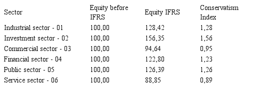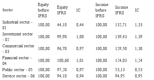 The investment sector had the lowest decrease of conservatism in Brazil. The major change in accounting practices in that sector was the fact that goodwill was no longer amortized, in accordance with IFRS. The change in Brazilian accounting practices that influenced the increase in conservatism in the commercial and services sectors refers to international accounting standard 21 – Effects of Changes in Foreign Exchange Rates.