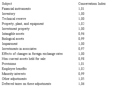 Index amounts greater than 1 indicate that the new accounting practices adopted in these countries were less conservative than those presented in that year in accordance with previous accounting standards. According to the Table 2, the financial statements in Brazil were less conservative after the adoption of IFRS (Equity´s Conservatism Index: 1,18), and the financial statements in Colombia show greater conservatism after convergence of their accounting standards to IFRS (Equity´s Conservatism Index: 0,94). The effect on profit for the period is the opposite, but this effect is timely. Lopes and Martins (2005) point out that conservatism is present in different normalizations. Nevertheless, according to the International Accounting Standards Board´s Framework, the financial information must be relevant and faithful.