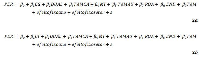 A Equação 2a foi testada incluindo o board interlocking - Centralidade de Grau (BI_CG) e expressa o percentual do número de empresas presentes na rede. A Equação 2b inclui o board interlocking - centralidade de intermediação (BI_CI), que representa a soma do número de geodésicas (menor distância que une dois pontos) entre os pares de empresas, dividido pelo número de geodésicas entre as organizações que compartilham um conselheiro.