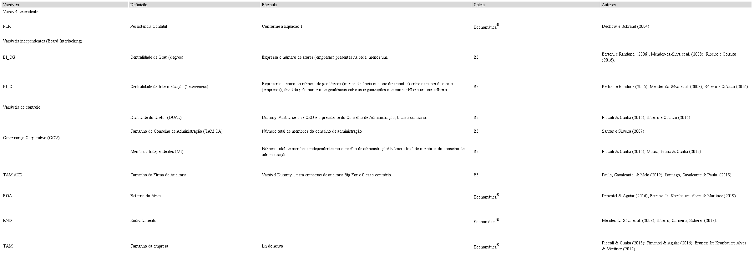 Os dados anuais utilizados para a análise da presente pesquisa foram coletados nos Formulários de Referência disponíveis no sítio da B3 e no banco de dados Economática®. Na Figura 1 apresentam-se as variáveis deste estudo.