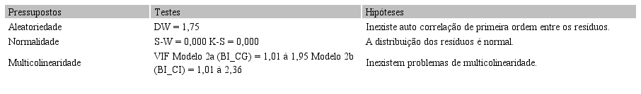 Esta seção demonstra a descrição e análise dos resultados evidenciados na presente pesquisa. Inicialmente apresenta-se os testes de aleatoriedade (auto correlação), normalidade e multicolinariedade dos dados. Aplicaram-se os testes de Durbin-Watson para autocorrelação dos resíduos, Shapiro-Wilke Kolmogorov-Smirnov para a normalidade e o teste Variance Inflation Factor (VIF) e Correlação de Spearman para a multicolinearidade. Os resultados dos pressupostos da regressão são apresentados na Tabela 1.