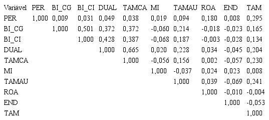 Os resultados demostrados na Tabela 2, referente à Correlação de Pearson entre as variáveis, percebe-se a existência de relação entre as variáveis. Conforme observado, a persistência dos resultados se correlaciona de forma significativa e positiva com oboard interlocking - centralidade de grau (0,009), boardinterlocking - centralidade de intermediação (0,031), a dualidade do diretor (0,049) o tamanho do conselho de Administração (0,038) e membros independentes (0,019). O que demonstra correlação entre a persistência dos lucros e as variáveis de governança corporativa.