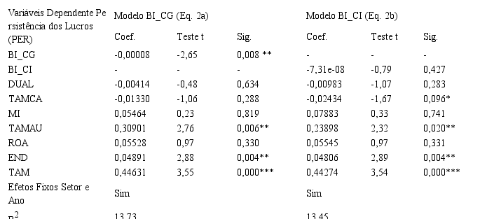Os resultados da regressão no que tange ao modelo desenvolvido por Dechow e Schrand (2004) são evidenciados a partir da Tabela 2. Nesta tabela apresentam-se os três modelos de regressão (1: Modelo Original, 2a: Modelo BI_CG e 2b: Modelo BI_CI) para todas as empresas da amostra. Espera-se que a persistência dos resultados seja mantida nas organizações mediante o board interloking e as práticas de governança corporativa.