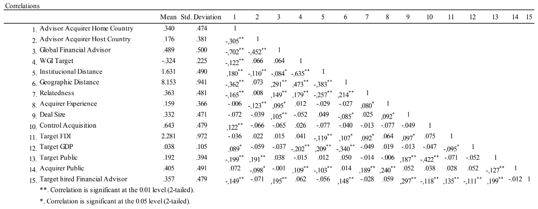 To test the hypotheses, we conducted three sets of logistic regressions, one for each dependent variable. In each case our variable is dichotomous since the acquirer firms may, or may not, hire a financial advisor. Table 1 presents the correlations matrix. The correlations are not as high as to raise multicollinearity concerns and there is no evidence of multicollinearity in the data. In all regressions, the variance inflation factor (VIF) ranged from 1.1 to 1.8.