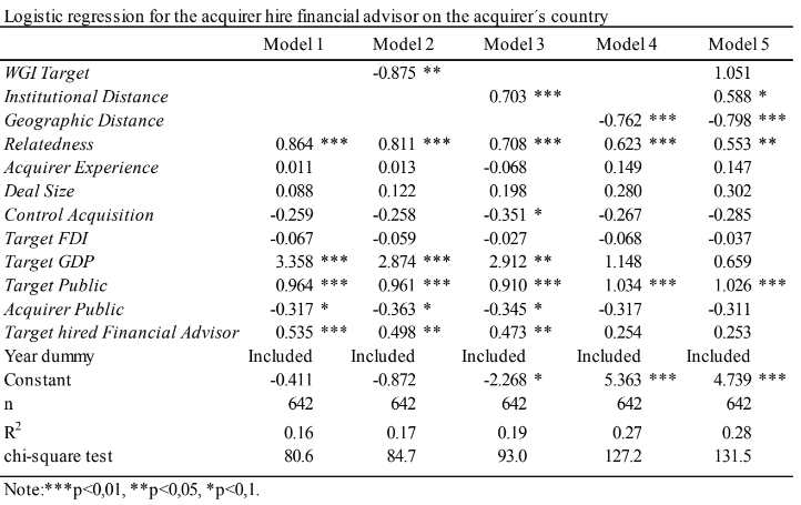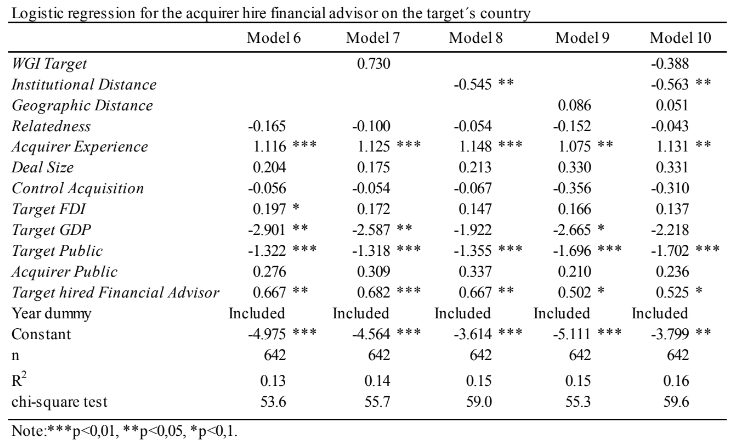 Table 3 includes the results of the logistic regression for the dependent variable: acquirer hires financial advisor in the target´s country. Model 6 includes only the control variables. Models 7 to 9 test the hypotheses, and model 10 is the complete model.