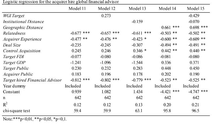 Table 4 includes the results of the logistic regression for the dependent variable: acquirer hires a global financial advisor. Model 11 includes only the control variables. Models 12 to 14 test the hypotheses. Model 15 is the complete model.