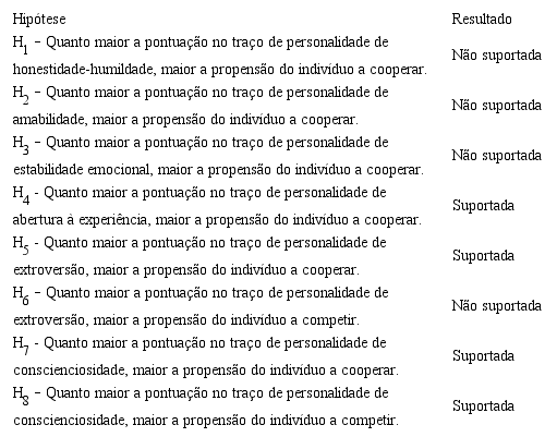 Por meio dos resultados, verificou-se que apenas o traço de personalidade denominado conscienciosidade, que inclui características como organização e disciplina (Shepherd & Belicki, 2008), está relacionado com a cooperação e competição, simultaneamente. Honestidade-humildade e amabilidade não apresentaram qualquer relação com a cooperação, diferente do apontado por estudos anteriores. Enquanto a estabilidade emocional apresentou efeitos contrários ao esperado, ou seja, alta pontuação neste traço de personalidade, na verdade, afeta negativamente a propensão do indivíduo para cooperar. O mesmo aconteceu na relação analisada entre extroversão e competição. Os resultados deste estudo demonstram que na amostra de alunos de pós-graduação na área de negócios, a extroversão está negativamente associada com a propensão para competir. Como esperado, a abertura à experiência e a extroversão se mostraram positivamente relacionados a cooperação individual.