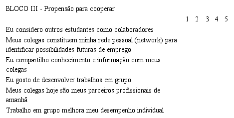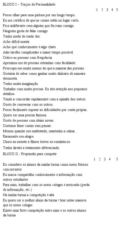 Na aplicação do questionário utilizou-se escala Likert de 5 pontos. Considerando-se que há evidências na literatura de que as mulheres reagem à competição e cooperação de forma distinta dos homens (Müller & Schwieren, 2012; Buunk et al., 2017), por este motivo, o gênero foi incluído como variável de controle da pesquisa.
