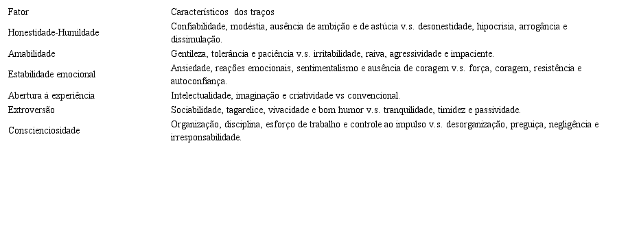 O modelo de personalidade Big Five prevaleceu nas décadas de 1980 e 1990, por predizer de forma consistente vários comportamentos. No entanto, resultados de estudos recentes têm conduzido ao desenvolvimento de um modelo mais abrangente, o HEXACO (Ashton & Lee, 2007, 2008). Esse modelo contempla seis fatores, como pode ser observado na Tabela 1.
