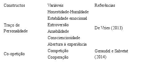 Para a mensuração da propensão dos indivíduos para competir e cooperar foram utilizadas as questões propostas por Geraudel e Salvetat (2014). Um resumo dos constructos, variáveis e as referências constam na Tabela 2. O questionário completo está disponível no Anexo I.
