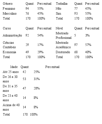 Os questionários foram encaminhados via e-mail para as secretarias dos cursos de pós-graduação stricto sensu (em nível de mestrado e/ou doutorado) dos cursos relacionados com a área de negócios (Administração, Ciências Contábeis e Economia) de Universidades Federais brasileiras, que disponibilizaram o e-mail de contato nas páginas on-line, solicitando o encaminhamento do questionário aos alunos do curso. Foram encaminhados e-mails para 27 programas de pós-graduação em Administração, 11 em Ciências Contábeis (ou Contabilidade) e 17 em Economia, no período de 10 de março a 04 de abril de 2019. Um total de 170 questionários válidos foram retornados pelos pós-graduandos.