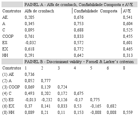 Observa-se que os construtos Abertura à Exp., Amabilidade, Conscienciosidade e Estabilidade emocional apresentaram cargas para a AVE estatisticamente significantes, isto é, com valores iguais ou superiores a 0,50, conforme preconiza Fornell e Larcker (1981), por outro lado, os constructos Cooperação, Extroversão e Honestidade-Humildade não obtiveram cargas estatisticamente significantes. O alfa de Cronbach excedeu a 0,70 para o constructo Competição. Nos demais constructos os valores ficaram abaixo de 0,70. A Confiabilidade Composta (Composite Reliability) apresentou valores maiores que 0,5. Verifica-se, na validade discriminante, que nenhuma das correlações entre os construtos foi superior a raiz quadrada da AVE, indicando que existe validade discriminante e convergente no modelo 1 proposto.