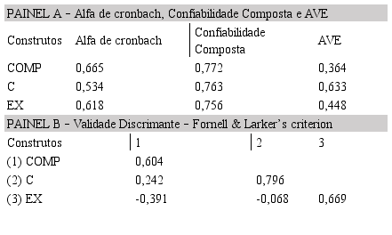 Para confirmar a validade discriminante das variáveis latentes do modelo determinou-se o valor da AVE (Average Variance Extracted). De acordo com Fornell e Larcker (1981), ela é confirmada quando o valor da raiz quadrada da AVE é maior que os valores absolutos das correlações com as demais variáveis latentes. Neste estudo, testou-se a validade discriminante pelo critério de Fornell e Larcker (1981).