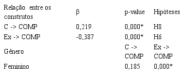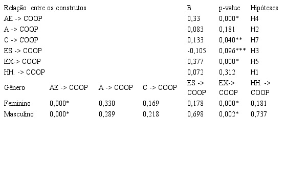No que se refere às relações entre extroversão e cooperação (H5) e extroversão e competição (H6), ambas apresentaram resultados significativos (p-valor=0,000 para ambos), no entanto os efeitos encontrados foram contrários. Enquanto a extroversão parece estar positivamente (0,377) relacionada à cooperação, o efeito sobre a competição é negativo (-0,387). Os resultados diferem dos achados de Ross et al. (2003) e Buunk et al. (2017) que encontraram relação positiva entre extroversão e competição, bem como do estudo de Geraudel e Salvetad (2014), que não identificaram efeitos significativos da extroversão sobre a propensão para competir ou cooperar.