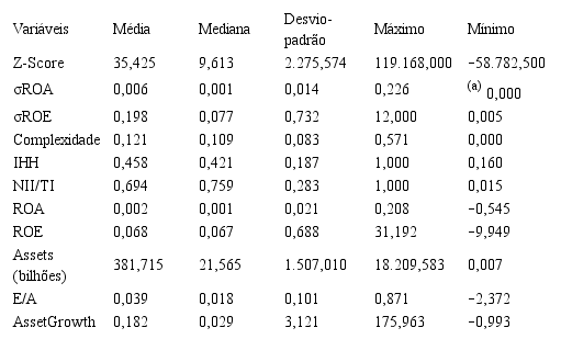 Na seção de análise de resultados desta pesquisa, utilizaremos os termos bancos e conglomerados de maneira intercalada para nos referir às instituições no seu nível consolidado. A tabela 1 apresenta as estatísticas descritivas das características dos conglomerados financeiros contidos na amostra final desta pesquisa. Os valores absolutos obtidos para as variáveis Z-Scorei,t, σROAi,t, σROEi,t, Complexidadei,t e IHHi,t não possuem interpretação prática, apenas teórica. Quanto às demais variáveis, teceu-se alguns comentários sobre o seu comportamento.