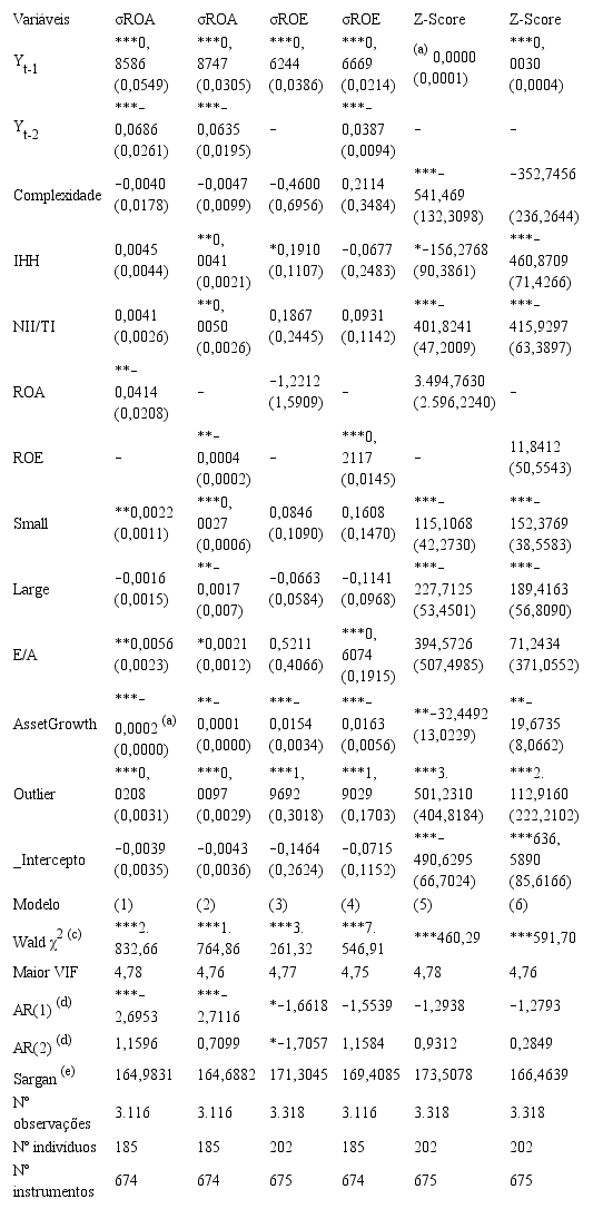 Conforme Allen e Gale (2004), bancos mais complexos podem explorar segmentos de mercado mais incomuns, que detém menor concorrência e, consequentemente, assumir menos riscos na exploração destas atividades. Baseado nos resultados de Liu et al. (2016), espera-se que bancos mais complexos apresentem menor risco, o que nos sugere uma relação negativa entre a variável Complexidadei,t e o σROAi,t ou σROEi,t, mas uma relação positiva entre a Complexidadei,t e o Z-Scorei,t.