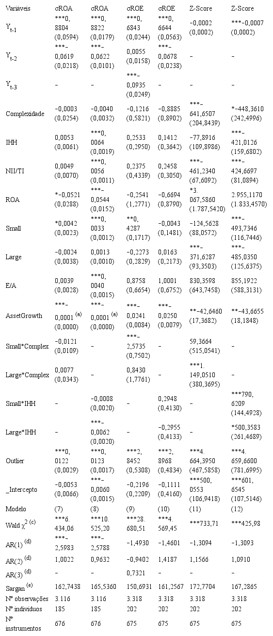 Apesar do resultado encontrado, entendemos que bancos maiores ou sistematicamente importantes, podem ter acesso a fontes de financiamento mais acessíveis e com menores taxas de juros (Mercieca et al., 2007, Lepetit et al., 2008), o que poderia indicar que a relação entre complexidade e risco muda de acordo com o porte das instituições. Conduzimos testes adicionais onde estimamos a Equação (5) adicionando, alternadamente, interações entre as dummies Smalli,t e Largei,t com as variáveis Complexidadei,t e IHHi,t. Para fins de simplificação, optamos por manter apenas o ROA como medida de lucratividade. Utilizou-se novamente o estimador System-GMM para verificar a relação entre a complexidade e o risco dos conglomerados financeiros. Os resultados das estimações estão expostos na Tabela 3.