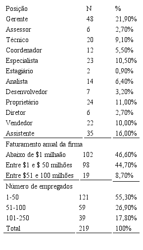 A pesquisa empírica para testar as relações propostas foi realizada por meio de survey com 219 PMEs norte-americanas, compondo a amostra analisada por meio da técnica de Structural Equation Modelling (SEM). As PMEs responderam ao instrumento de pesquisa por meio eletrônico, na plataforma Qualtrix, a partir da base de respondentes do sistema Mturk. O sistema Mturk possui respondentes em grande número de países, e para este trabalho foram aceitos respondentes residentes e vinculados a firmas norte-americanas. Adicionalmente, outros testes de validade foram conduzidos, como análise da qualidade de respostas, tempo de respostas, aprovação do respondente, etc.