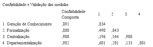 De forma a obter validação interna das medidas utilizadas no estudo, apresentamos na Tabela 3 os índices de confiabilidade composta e as intercorrelações para os construtos do estudo, conforme os procedimentos sugeridos por Fornell e Larker (1981) . Foram verificados os seguintes indicadores: chi-square (X²) = 1,736, Root MeanSquare Error of Approximation (RMSEA) = 0,050, Tucker-Lewis Index (TLI) = 0,949, ParcimoniousNFI (PNFI) = ,726, ParcimoniousGFI (PGFI) = 0,660, ParcimoniousCFI (PCFI) = 0,765, Incremental Fit Index (IFI) = 0,960, Goodness-of-Fit (GFI) = 0,925. Todos índices apresentaram-se válidos, e indicam um bom modelo, conforme a literatura.