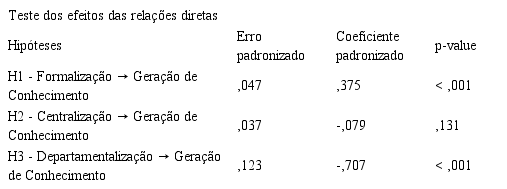 A hipótese H3 foi suportada, apresentando relação negativa entre a departamentalização (γ = -,707, sig. <0,001) e a GC. As hipóteses H1 e H2 não foram suportadas. A H2 (centralização--> GC) teve resultado positivo e não significativo (γ = -,079, sig. = ,131). Já a H1 (formalização-->GC) teve resultado positivo e significativo (γ = ,375, sig. <0,05), contrariando as expectativas iniciais verificadas com base em estudos passados (Chuang et al., 2007; Mahmoudsalehi et al., 2012). Os testes dos efeitos podem ser vistos na Tabela 4 a seguir.