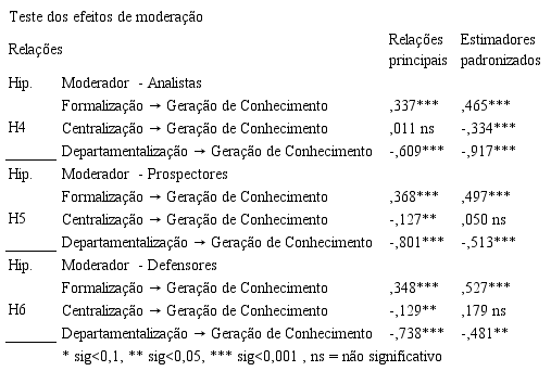 No teste do construto moderador OE analista, verifica-se uma relação (H4a) em que há impacto positivo significativo, ocorrendo na antecedência da formalização à GC (γ = ,465). Nas relações entre centralização (H4b; γ = -,334) e departamentalização (H4c; γ = -,917), antecedendo à GC, houve impacto negativo significativo, o que contraria nossas expectativas iniciais. Este resultado evidencia a OE como estando ligada à estrutura funcional da organização, na figura da formalização, centralização, e departamentalização (Grigoriou & Rothaermel, 2017; Schlechter, Thompson, & Bussin, 2015) . Os efeitos encontrados podem ser acompanhados na Tabela 5 abaixo.