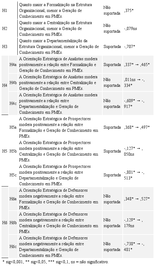 Já o teste da H3 confirmou-se. Isso significa que, em consonância com o que coloca a literatura, a departamentalização afeta negativamente a GC em PMEs (Sołek-Borowska, 2017) . Poder-se-ia imaginar que o tamanho reduzido dessas firmas permitisse uma departamentalização sem prejuízo à qualidade das trocas informações. Entretanto, nossos resultados mostram que, de fato, a organização da PME em diferentes departamentos tende a diminuir sua capacidade de produzir novos conhecimentos e, consequentemente, auferir os ganhos daí advindos (inovação, competitividade etc.).