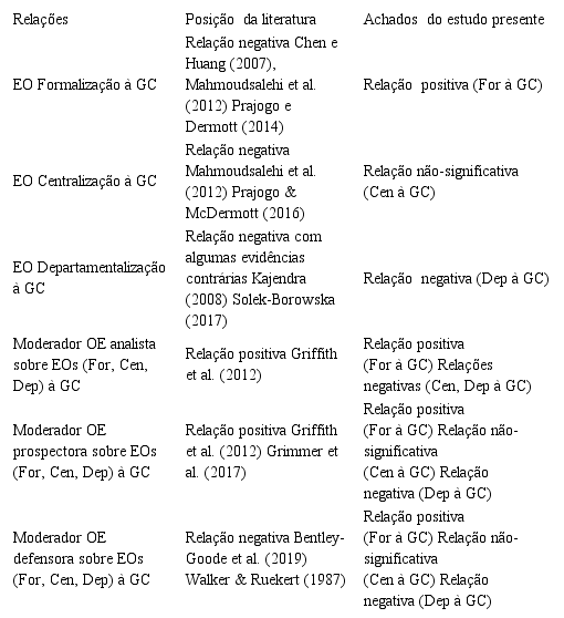 As evidências que oferecemos nesse estudo também oferecem mãos detalhes a respeito dos efeitos moderadores das diferentes OEs (analista, prospectora e defensora) sobre as relações estabelecidas entre as EOs e a GC. É interessante notar, por exemplo, que a relação positiva EO formalização-->GC e a relação negativa EO departamentalização--> são robustas a qualquer OE. Novos estudos qualitativos podem descrever por que ambas as relações permanecem as mesmas mesmo frente a OEs completamente diferentes.