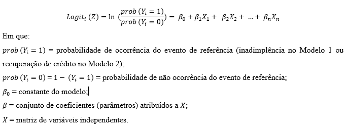 Quanto à técnica estatística para a estimação dos modelos optou-se pela regressão logística binária que, segundo Sicsú (2010) e Louzada et al. (2016), é uma das técnicas mais utilizadas em modelos de credit scoring e collection scoring e em pesquisas acadêmicas da área, além de ser mais adequada para visualizar o impacto de cada potencial variável explicativa. Nas estimações de modelos desenvolvidas nesta pesquisa, assumiu-se como ponto de corte das regressões logísticas, o valor padrão de 0,5. Em síntese, a especificação dos modelos de regressão logística é dada por: