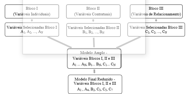 Quanto à seleção das variáveis independentes para a composição dos modelos finais determinantes de inadimplência e determinantes de recuperação de crédito, esta ocorreu por meio de uma “seleção por blocos”, descrita na Figura 1. Na “seleção por blocos”, todas as variáveis que possuíam ao menos uma categoria com significância estatística foram selecionadas para um modelo mais amplo, composto por variáveis individuais, contratuais e de relacionamento. Desse modelo consolidado amplo foram excluídas as variáveis sem significância estatística, obtendo-se os modelos finais de determinação de inadimplência/ recuperação de crédito. Decidiu-se pela seleção das variáveis que apresentaram resultados em nível de significância de 10% (p-valor < 0,10).