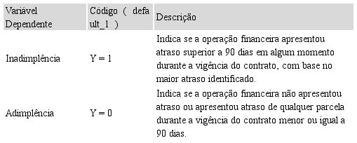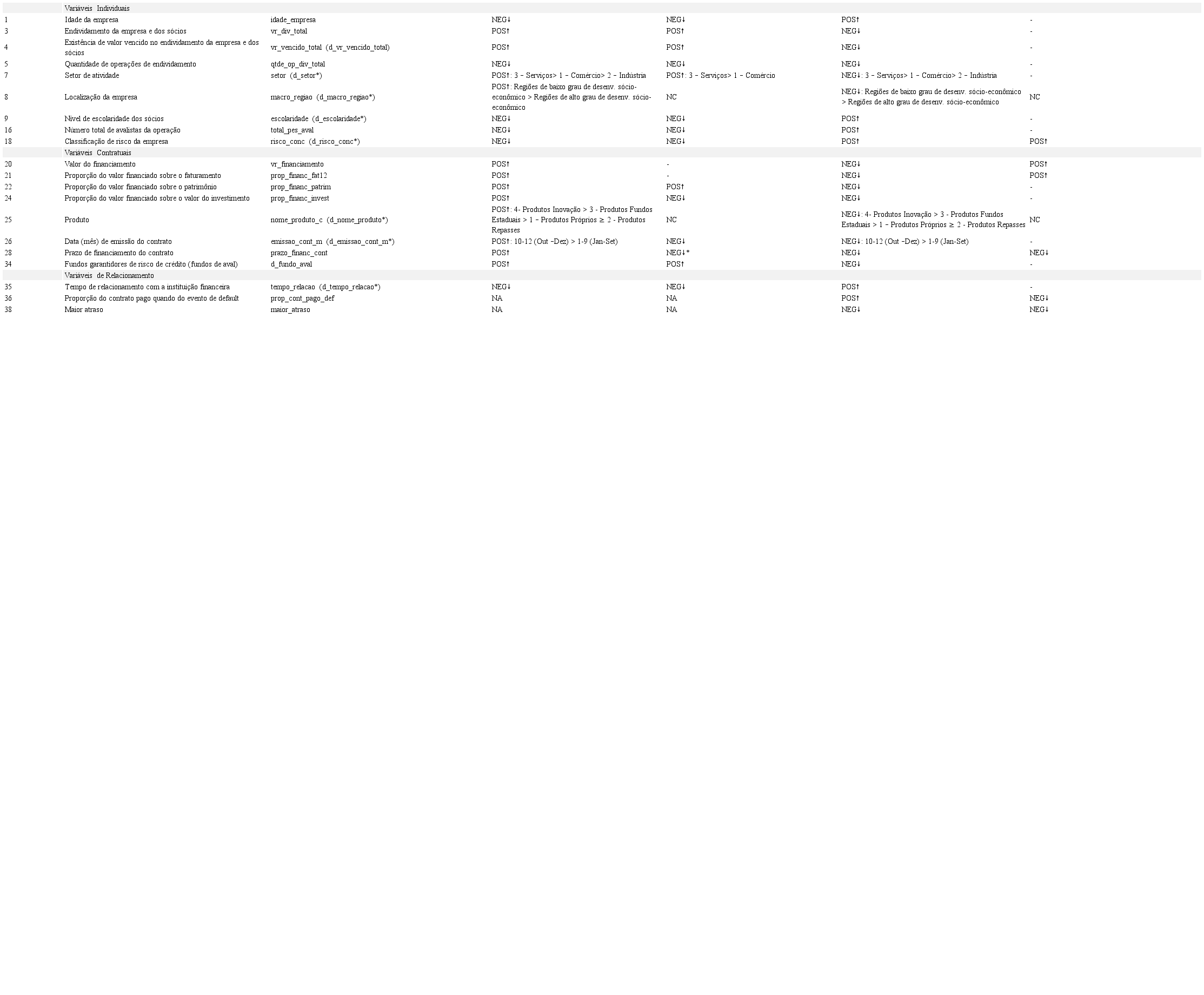 As variáveis independentes representam os fatores que potencialmente são capazes de impactar os eventos de inadimplência e de recuperação de crédito, tendo a escolha das variáveis individuais, contratuais e de relacionamento sido feita com base na disponibilidade dos dados e na revisão de trabalhos teóricos e empíricos realizada. O Quadro 3 apresenta as variáveis explicativas utilizadas neste estudo, com os respectivos códigos, as especificações das variáveis originalmente categóricas e as relações esperadas entre as variáveis dependentes e independentes.