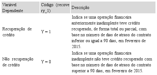 Quanto à importância das variáveis contratuais para a recuperação de crédito, Khieu et al. (2012, p. 932) verificam que “as características da operação de crédito são determinantes mais significativos de taxas de recuperação de crédito do que as características da empresa tomadora de crédito antes da inadimplência”. Neste sentido, o maior número de informações acarreta maior credibilidade ao modelo desenvolvido, sendo importante considerar as características da operação conjuntamente às do próprio cliente. Espera-se, pois, maior valor explicativo de modelos de estimação que considerem variáveis que avaliam riscos distintos (Sicsú, 2010).
