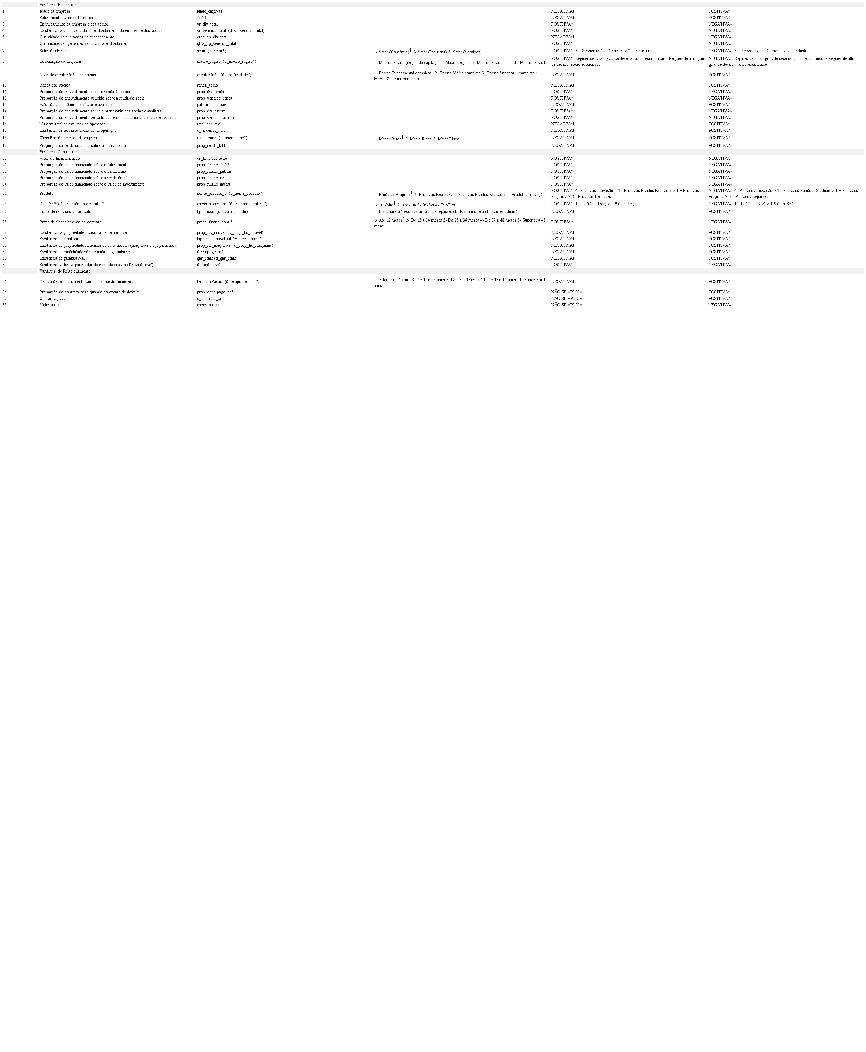Dentre as variáveis individuais identificadas e utilizadas em outros estudos teóricos e empíricos, destacam-se: (a) Idade da empresa (Bonfim, 2009; Bhimani et al., 2010; Camargos et al., 2012); (b) Tamanho da empresa (Bhimani et al., 2010; Fenech et al., 2016); (c) Faturamento (Grunert & Weber, 2009); (d) Setor (Acharya et al., 2007; Khieu et al., 2012; Belaid et al., 2017); (e) Localização da empresa (Camargos et al., 2012); (f) Endividamento da empresa (Khieu et al., 2012; Fenech et al., 2016); (g) Patrimônio da empresa e dos avalistas (Camargos et al., 2012); (h) Escolaridade dos sócios (Camargos et al., 2012); (i) Classificação de risco da empresa (Silva et al., 2009; Khieu et al., 2012).