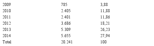 A Tabela 1 apresenta o número de contratos da amostra classificados com base no ano da concessão do crédito. Foram considerados os contratos emitidos no período de novembro de 2009 a novembro de 2014, o que justifica o pequeno número de observações para o ano de 2009. Além disso, é possível observar um considerável aumento no número de operações financeiras para micro e pequenas empresas a partir do ano de 2012, sugerindo um período de estratégia de expansão da carteira de crédito em termos de número de contratos.